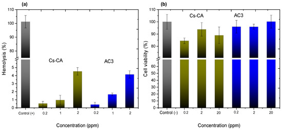 (a) Hemolysis percentages for Cs-CA and AC3 samples at 0.2, 1, and 2 ppm. All data are presented as the mean value ± SD, where n = 5; (b) cell viability percentages for Cs-CA and AC3 samples at 0.2, 2, and 20 ppm after 24 h of exposure in VERO CCL-81 cell cultures. All data are presented as the mean value ± SD, where n = 3.