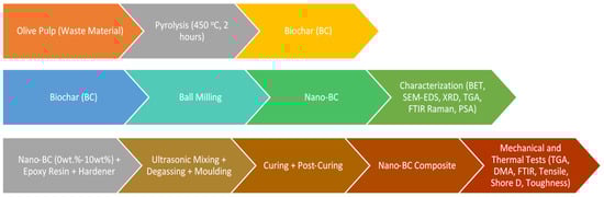 In this study, the mechanical and thermal properties of epoxy-based composites were investigated using nano-BC obtained from olive pulp. This study was carried out in three main stages: (1) nano-BC production, (2) characterization studies, and (3) composite production and testing processes. A general flow chart of this process is presented below (Figure 1).