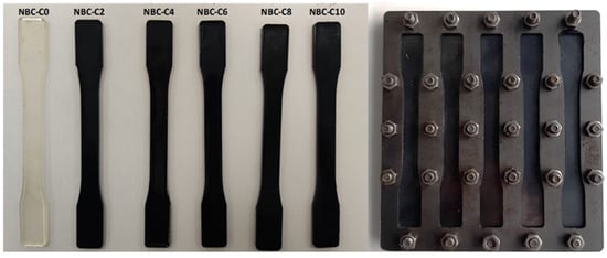 According to the recipe shown in Table 1, composite samples were obtained by adding nano-biochar (nano-BC) to epoxy resin. Within the scope of this study, six types of composite samples containing nano-biochar in different proportions were produced. The NBC-C0 sample contained only pure epoxy resin, the NBC-C2 sample contained 2% nano-biochar, the NBC-C4 sample contained 4% nano-biochar, the NBC-C6 sample contained 6% nano-biochar, the NBC-C8 sample contained 8% nano-biochar, and the NBC-C10 sample contained 10% nano-biochar supplement. LR350-coded resin and LG350-coded hardener supplied from Dost Kimya A.Ş. (Istanbul, Türkiye) were used as the epoxy resin. The epoxy resin used in this study had a 600–900 mPa·s viscosity and was a two-phase mixture comprising 80–90% diglycidyl ether bisphenol A and 10–20% aliphatic diglycidyl ether. In order to obtain an optimal dispersion of the fillers in the matrix, a mixture of epoxy resin and nano-BC was used by immersing a TT13 ultrasonic probe (SONOPLUS HD2200, Bandelin, Berlin, Germany) for 5 min. The ultrasonic probe homogenization was performed in an ice bath at 0 °C. Gas bubbles trapped in the fluid mixture in the glass beaker were removed by sonication (Elma sonic P60H, Singen, Germany) for 10 min. The mixture was then poured into a metal mold made according to ASTM D 638-4 [30] to produce five specimens in the shape of dog bones. The dimensional tolerance of this mold was ±0.1 mm for all specimens. Finally, degassing was carried out in a low vacuum chamber (50 mbar) for 20 min. Five samples of each concentration were prepared to monitor reproducibility and subject the results to statistical analysis (Figure 3). The curing process was carried out at room temperature (25 °C) for 24 h. Subsequently, the samples were post-cured at 80 °C for 6 h. The curing and post-curing parameters were based on the resin’s recipe for the user. However, in the post-curing process, there was no significant increase in the Shore D hardness value, which was determined as 6 h, and after post-curing at a longer time and higher temperature, warping and demolding problems were encountered in the samples. The amount of the mixture combination of nano-BC, epoxy resin, and hardener was determined as 75 g for five samples, and the distribution according to the amount of nano-BC is given in Table 1. During the process, a catalyst and accelerator were employed to ensure a more uniform dispersion of the two materials.
