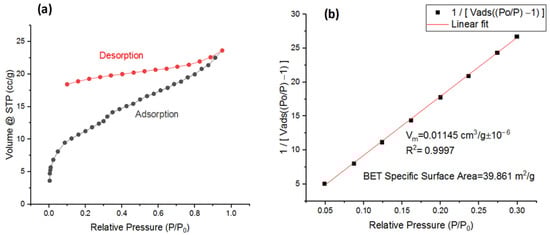 The properties of the surface area and porosity of the nano-BC were evaluated from nitrogen adsorption isotherms at 77.3 K using the Brunauer–Emmett–Teller (BET) method. The adsorption–desorption curve obtained a Type IVa isotherm according to the IUPAC classification (Figure 4a). This is characteristic of mesoporous materials and demonstrates a strong correlation between the pore volume and surface area of the material [32]. The specific surface area of the nano-BC was calculated as 39.861 m2/g (Figure 4b). This reveals that the biochars obtained at the nano scale had a very high surface area and offered high interfacial interaction potential within the epoxy matrix. Thanks to this structure, polymer chains could physically penetrate the porous structure of the nano-BC, which could create interfacial interactions that provide effective load transfer without the need for a coupling agent.