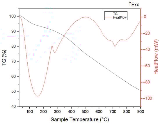 The nano-BC’s TGA and DSC graph in Figure 8 reveals that it contained about 5% moisture. However, volatile compounds and organic structures were present in the nano-BC, as seen from the endothermic DSC peak at 200–600 °C. This presence showed around 20% volatile matter in the structure, except for free moisture, between 200–600 °C, as shown in Figure 8. Following the temperature increase beyond 650 °C, the material exhibited an endothermic reaction, indicating the onset of thermal decomposition.