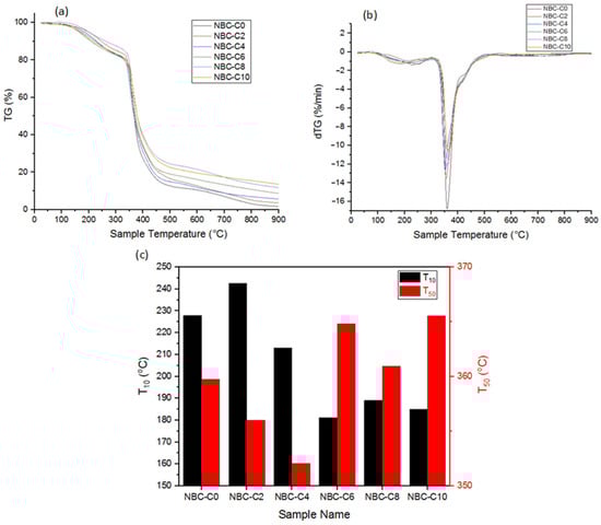 Figure 9a shows the TGA graphs of the epoxy control sample and nano-BC-doped composites. The effect of the TGA graph of the epoxy resin on the thermal decomposition temperature of the composite samples prepared by doping at different ratios was limited. Figure 9b,c shows the variation in dTG, T10 (temperature at 10% mass loss, i.e., temperature at which thermal degradation is considered to start), and T50 (temperature at 50% mass loss, i.e., temperature at which thermal degradation is considered to be maximum) according to the nano-BC additive ratios. Adding graphitic nano-BC at different ratios to the epoxy had two distinct effects on its thermal stability. Increasing the nano-BC doping facilitated the removal of volatile molecules from the epoxy matrix (decrease in T10 temperature) but increased the fragmentation temperature of the main chain (increase in T50 temperature). Although the increase in the temperature value required for complete thermal degradation was limited with nano-BC doping, the degradation rate slowed down, as can be seen in the dTG graph (Figure 9b).