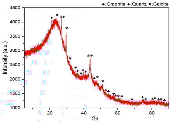 X-ray diffraction (XRD) analysis was performed on the nano-BC particles, and the spectrum given in Figure 11 was obtained. The phases matched through the HighScore Plus© version 4.6a program were graphite (ICSD code: 29123), calcite (ICSD code: 18164), and quartz (ICSD code: 166601). The endothermic DSC peak and mass decrease after 650 °C in the TGS analysis can be confirmed by the calcination of CaCO3. The stacking of aromatic graphite layers between 20° and 30° is represented by the diffraction features in the XRD spectrum that the nano-BC displayed. The existence of tiny crystallites orientated perpendicular to these aromatic layers was responsible for the region’s broadening [33].