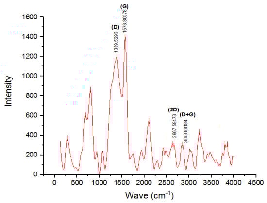 The Raman spectrum of the nano-BC sample is shown in Figure 12. Raman spectroscopy was also utilized in addition to XRD examination to ascertain whether or not the nano-BC structure was in a graphite structure. The nano-BC characteristically had a D band around 1350 cm−1 due to structural defects and a G band around 1590 cm−1 due to sp2 hybridization. The intensity of the peaks in these Raman shift regions indicates that the structure was an amorphous or graphite structure. Since the D/G ratio was less than 1, it was determined that the structure was graphitic. The presence of prominent peaks of the 2D band around 2700 cm−1 and the D+G band around 2900 cm−1 in the Raman pattern indicates that the structure was a graphite structure showing sp2 hybridization [34].