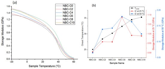 (a) Variation in storage modulus with temperature of composites; (b) onset temperature and storage modulus at 25 °C and 50 °C of composites.