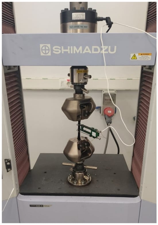 The mechanical parameters, including the modulus, tensile deformation, and tensile strength, were assessed by ASTM D638 [30] using universal testing equipment (Shimadzu 10 kN, Shimadzu AG-X model, Kyoto, Japan) (Figure 15). The experiments were conducted at room temperature with a constant displacement speed of 2 mm/min. The displacement of the specimens was measured using an extensometer. Stress vs. strain data were acquired and compared with neat epoxy resin and between the samples (Figure 16).