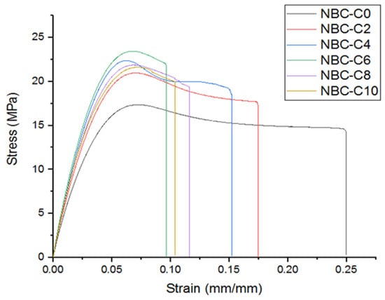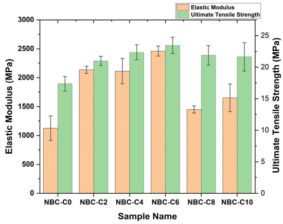 The tensile test results were analyzed to evaluate the mechanical performance of the composites containing different weights (wt.%) of nano-BC, as shown in Figure 17. According to the obtained stress–strain curves, it was observed that the stress along the elastic region increased linearly with the strain in all samples and then transitioned to the plastic deformation region, at which point the breaking point was reached. With the increase in the nano-BC content, a significant increase in the modulus of elasticity was observed, while in terms of the maximum tensile strength, it was seen that the highest values were reached in the 6 wt.% range. However, at 10 wt.%, it was determined that the mechanical strength decreased, and the material became more brittle when the composites had a higher wt.% of nano-BC. It was seen that the nano-BC content could weaken the bonding within the matrix and reduce the ductility of the material after a certain level.