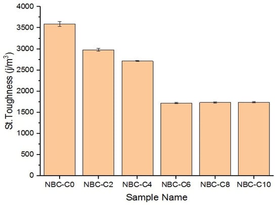 Static toughness is a measure of the maximum capacity of a material to withstand load before breakage. Figure 19 shows the static toughness values of the polymer composites containing different percentages of nano-BC by weight. The neat epoxy specimen (0 wt.% C) had the highest static toughness (3.592 MJ/m3). As the content of nano-BC increased, the toughness decreased significantly. The static toughness in the 2 wt.% and 4 wt.% nano-BC samples was calculated as 2.980 MJ/m3 and 2.8915 MJ/m3, respectively. The lowest static toughness was observed in the sample containing 6 wt.% nano-BC (1.717 MJ/m3). A small recovery was observed in the sample containing 8 wt.% nano-BC, and a value of 1.346 MJ/m3 was obtained. The sample containing 10 wt.% nano-BC had a similar static toughness (1.765 MJ/m3) as the 6 wt.% nano-BC sample, but the increase was quite low. According to these results, the 0 wt.% nano-BC sample exhibited ductile behavior and absorbed more energy until it was broken. The material became brittle in the sample with the lowest toughness, 6 wt.% nano-BC, and it had a decreased energy absorption capacity.