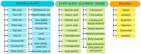 Bio-based organic PCMs are derived from renewable sources and include substances of plant or animal origin, fatty acids, esters, and polyols [32]. Figure 1 illustrates the bio-based PCMs classified according to their nature and origin.