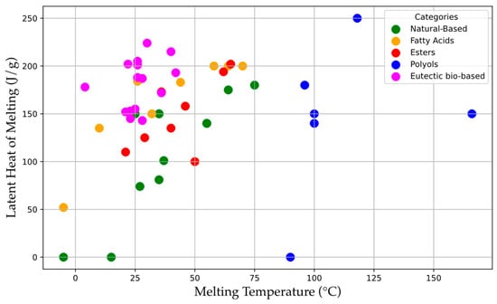 Melting temperature vs. latent heat of melting for bio-based PCMs. Source: Scopus. The data presented were derived from an analysis of publications from 2020 to 2025, conducted on 15 March 2025.