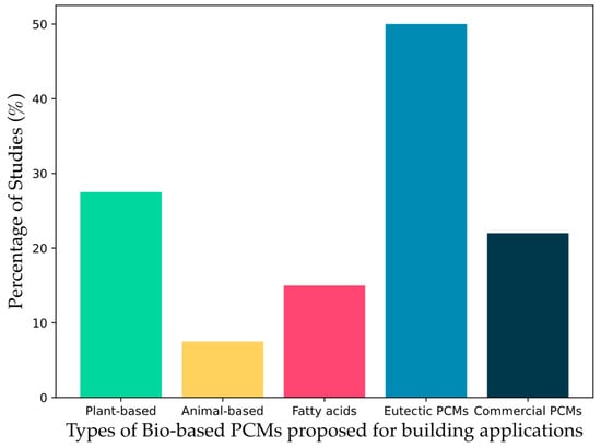 Figure 3 shows the results of the literature review of the paper published in the last five years on the use of bio-based PCMs in building applications. Among the studies reviewed, 22% focused on commercial bio-based PCMs; however, the exact composition of these PCMs is not always specified, leaving the nature of the bio-based materials used unclear [36,37,38,39,40,41,42,43,44]. Of the studies where the nature of the bio-based PCMs was reported, 27.5% were plant origin [45,46,47,48,49,50,51,52,53,54,55], 7.5% were animal origin [56,57,58], 15% related to single fatty acids [59,60,61,62,63,64], and 50% focused on eutectic mixtures based on bio-based components [65,66,67,68,69,70,71,72,73,74,75,76]. These data are presented in Figure 3.