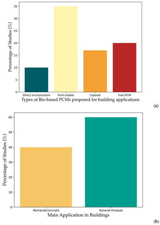 Studies on bio-based PCMs proposed for building applications, published in the last 5 years (2020–2025). (a) Main method used to develop bio-based PCMs for building applications; (b) main applications of bio-based PCMs in buildings. (Source: Scopus. Date of the analysis: 15 March 2025).