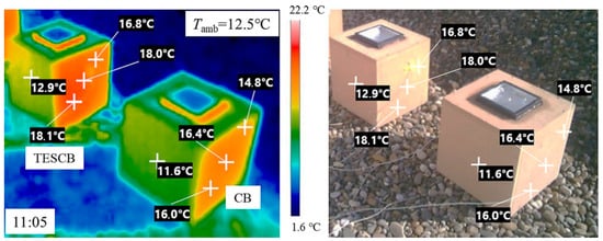 Experimental setup used on both the test and control rooms. On the (right), the test cells made with the reference mortar and the mortar containing the PCM; on the (left), the same test cells observed through the thermal camera. Reprinted from [65], with permission from Elsevier (April 2025).