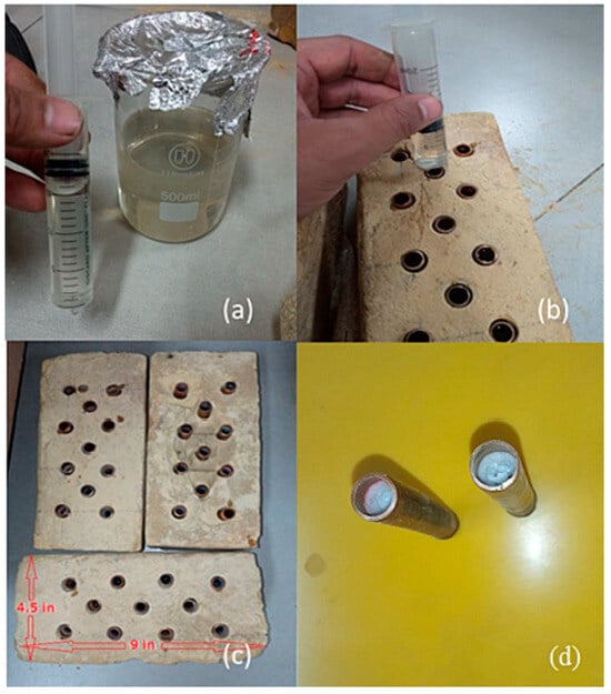 Phases of PCM integration in clay bricks: (a) molten PCM; (b) filling copper tubes with molten PCM; (c) copper tubes containing PCM in the bricks; (d) the eutectic PCM solidified inside the copper tubes. Reprinted from [71] with permission from Elsevier (April 2025).