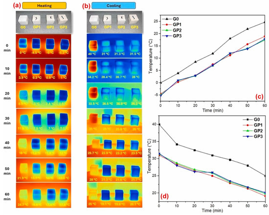 Thermal behavior of gypsum/PCM samples at different compositions: (a) heating phase; (b) cooling phase; (c,d) temperature fluctuations of gypsum/PCM. Reprinted from [60] with permission from Elsevier (April 2025).