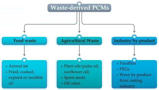 Waste-derived PCMs are those obtained from industrial by-products or waste streams; therefore, they can offer, at the same time, solutions for waste management and thermal energy storage [23,82]. These materials can include used oils, waxes, polymers recovered from various industries, such as petrochemical and textiles, and food processing waste. The recovery of this waste to produce functional PCMs can be doubly advantageous because it would otherwise be discarded, contributing to waste accumulation and environmental pollution [13,22,24]. Figure 8 summarizes the main waste-derived PCMs.
