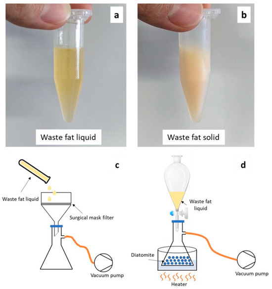 (a) Waste fat in liquid form and (b) waste fat in solid form used during the impregnation procedure for (c) surgical mask filter and (d) diatomite. Reprinted from [85], with permission from Elsevier (April 2025).