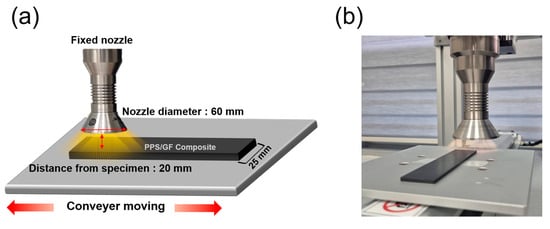 The PPS compounds reinforced with 65 wt% short glass fiber were supplied by Toray Advanced Composites Corporation (Tokyo, Japan). The PPS matrix (TORELINATM series, Toray Advanced Composites Corporation, Tokyo, Japan) exhibits excellent thermal and mechanical properties, including a tensile strength of approximately 150 MPa, a tensile modulus of ~6.0 GPa, a flexural strength of ~496 MPa, and a heat deflection temperature (1.8 MPa) of approximately 237 °C. The glass fiber contributes additional strength, with a tensile strength of ~610 MPa and a tensile modulus of ~33.8 GPa. The resulting PPS/GF composites exhibit a composite density of approximately 1.73 g/cm3. The plate samples, with dimensions of 100 mm (width) 100 mm (length) 3 mm (thickness), were manufactured using an injection molding process at a barrel temperature of 300 °C and a mold temperature of 140 °C, injection pressure of 80 MPa, cooling time of 30 s, and mold holding time of 10 s [9]. Furthermore, the injected plate samples were cut to dimensions of 25 mm 100 mm 3 mm (width length thickness) for the single-lap shear test. A schematic illustration of the sample preparation is shown in Figure S1.