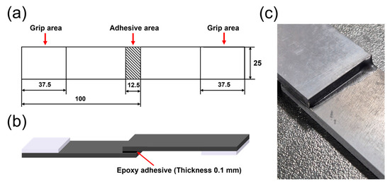 (a) Scheme of specimen dimensions in accordance of the ISO 4587 standards, (b) Schematic illustration of the single lap shear test specimen, and (c) Photograph the bonded region of the PPS/GF composites specimen for the single lap shear test.