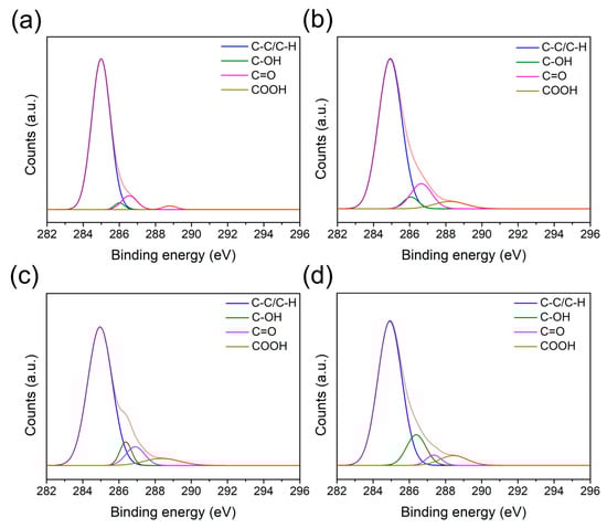 The XPS C1s spectra of the PPS/GF composites at varying plasma-treatment speeds are shown in Figure 3 and summarized in Table 3. C1s peaks were deconvoluted into C–C (285 eV), C–OH (286.2 eV), C=O (286.9 eV), and COOH (288.7 eV) [29]. Comparing the control PPS/GF composites and the plasma-treated PPS/GF composites, the C–C/C–H ratio in the untreated sample was 89.67%, which decreased to 78.85%, 79.5%, and 77.45% at 6, 2, and 1 m/min, respectively. This reduction was likely due to the removal of organic contaminants from the surface and oxidation caused by the plasma treatment. On the contrary, the C–OH and COOH ratios increased from 2.05% (no plasma) to 4.02% (1 m/min plasma) and from 1.53% (no plasma) to 5.22% (1 m/min plasma), respectively. However, the C=O ratio, which increased from 6.74% to 11.91%, decreased to 8.11% at a speed of 2 m/min and to 3.46% at a speed of 1 m/min. This phenomenon is presumed to be due to the conversion of C=O to COOH, and this tendency becomes more pronounced as plasma irradiation increases.