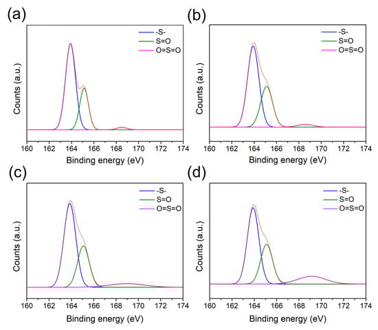 The XPS S2p spectra of the PPS/GF composites at varying plasma-treatment speeds are shown in Figure 4 and summarized in Table 4. The S2p peaks were deconvoluted into –S– (163.9 eV), S=O (165.0 eV), and O=S=O (168.4 eV) peaks [27,30]. The –S– ratio of the control specimen, initially at 68.99%, decreased to 63.83%, 62.11%, and 56.28% at plasma-treatment speeds of 6, 2, and 1 m/min, respectively. This reduction was attributed to the etching effect induced by the plasma treatment and the oxidation of sulfur, leading to the formation of S=O and O=S=O bonds. At a speed of 6 m/min, the S=O and O=S=O ratios slightly increased from 29.09% (no plasma) to 33.29% and from 1.91% (no plasma) to 2.86%, respectively. However, at speeds of 2 and 1 m/min, the S=O ratios decreased to 30.01% and 30.07%, whereas the O=S=O ratios increased to 7.86% and 13.64%. These results indicate that the S=O bonds are gradually converted into O=S=O bonds, which are more stable [27].