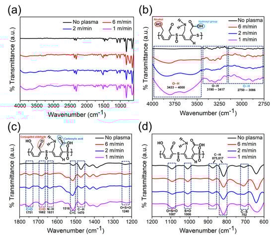 FT-IR spectra of the PPS/GF composites with various plasma treatment speeds (No plasma, 6 m/min, 2 m/min, 1 m/min), highlighting the formation and evolution of oxygen-containing functional groups: (a) Full range spectra (600–4000 cm−1), (b) O–H stretching region (2750–4000 cm−1), (c) carbonyl and aromatic C=C region (1200–1800 cm−1) and (d) Fingerprint region (600–1200 cm−1).