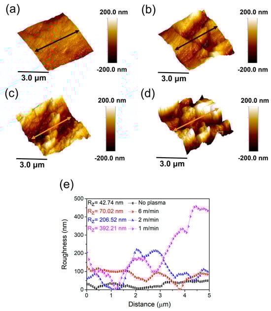 The surface roughness profile and 10-point average roughness (Rz) of the PPS/GF composites at varying plasma-treatment speeds are shown in Figure 6. At a plasma-treatment speed of 6 m/min, Rz increased by 64%, from 42.74 nm to 70.02 nm. This increase can be explained by the partial removal of surface contaminants and mild surface etching caused by reactive species in the plasma. At lower plasma-treatment speeds of 2 m/min and 1 m/min, the Rz significantly increased to 206.52 nm (+383%) and 392.21 nm (+817%), respectively, compared with the control sample. At lower treatment speeds, the longer exposure time allows the plasma to more strongly react with the surface. This causes more noticeable etching, forming uneven microstructures. These structures increase the surface area, improving mechanical interlocking with the epoxy adhesive.