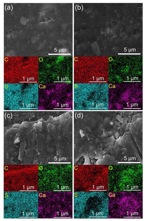 SEM images and EDS mapping of PPS/GF composites at varying plasma-treatment speeds: (a) No plasma, (b) 6 m/min, (c) 2 m/min, and (d) 1 m/min.