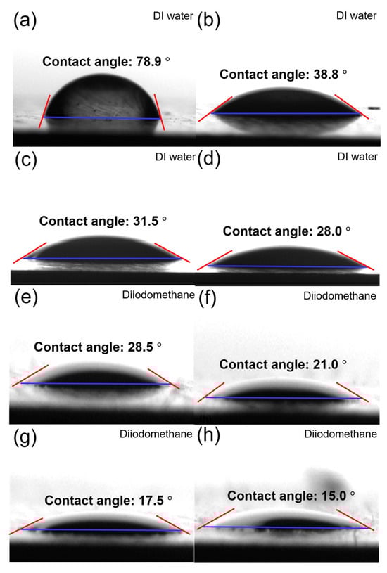 Contact angles measured using DI water and diiodomethane on the surface of the PPS/GF composites at varying plasma-treatment speeds: (a,e) No plasma, (b,f) 6 m/min, (c,g) 2 m/min, and (d,h) 1 m/min. (a–d) show DI water droplets, and (e–h) show diiodomethane droplets. Red lines indicate the fitted tangent at the droplet-solid interface used to calculate the contact angle, and blue lines represent the baseline of the solid surface.