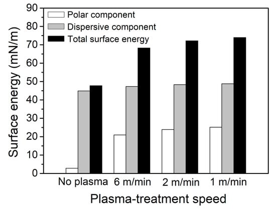Wettability describes how well a liquid spreads on a solid surface and plays a crucial role in bonding strength. Higher wettability increases the contact area between the adhesive and substrate, leading to stronger bonding. Wettability is typically evaluated using contact angle measurements, where a lower contact angle corresponds to better wettability. The contact angles—measured using diiodomethane (the dispersive component) and DI water (the polar component)—are shown in Figure 8. The water contact angle in the control sample was 78.9°, whereas at a plasma-treatment speed of 6 m/min, it decreased significantly to 31.5°, indicating a sharp increase in wettability. At speeds of 2 m/min and 1 m/min, the contact angles decreased further to 28.5° and 17.5°, respectively. This trend indicates that lower plasma-treatment speeds introduce a greater number of oxygen-containing functional groups onto the surface, thereby enhancing wettability. For diiodomethane, the contact angle of the control sample was 38.8°, which decreased to 28.0°, 21.0°, and 15.0° at 6, 2, and 1 m/min, respectively. Because diiodomethane contains only dispersive components, the reduction in contact angle can be attributed to the increase in surface roughness caused by the plasma treatment, which likely enhances wettability.