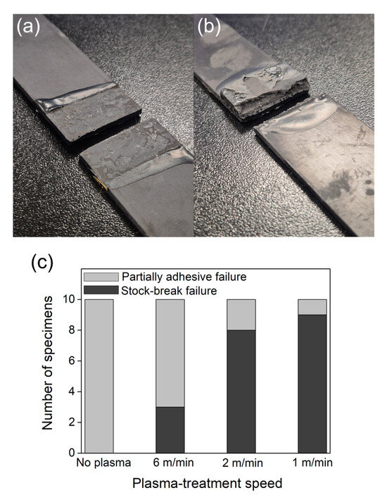 Representative failure morphologies and failure mode distribution according to plasma-treatment speed: (a) partial adhesive failure showing interfacial debonding, (b) stock-break failure indicating cohesive fracture within the substrate, and (c) failure mode distribution (partial adhesive vs. stock-break) across different plasma-treatment speeds.