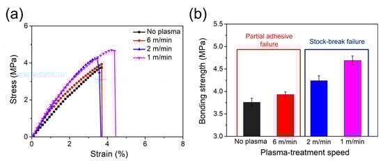 (a) Stress–strain curves and (b) bonding strength between PPS/GF composites and epoxy adhesives at varying plasma-treatment speeds.