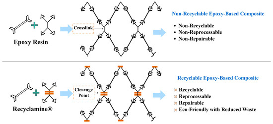 Schematic comparison of polymer links in conventional epoxy and Recyclamine® systems.