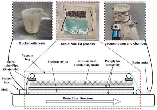 Schematic diagram of the VARTM process and photographs of the actual manufacturing setup.