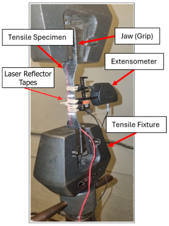 Tensile tests were carried out on an MTS universal test machine [40]. Dog-bone test specimens with dimensions of 250 × 25 (at the gauge length) × 2.5 mm3 were used for both composites. Waterjet cutting was used as per the CAM design to realize dimensional accuracy and precision without affecting the materials’ properties. Figure 4 depicts the test setup of basalt–epoxy specimens used in tensile testing.