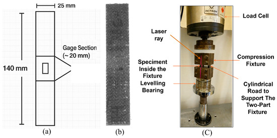 Compression tests were performed in accordance with the ASTM D6641M-16e2 standard on a Combined Loading Compression (CLC) test fixture [41]. Rectangular specimens with dimensions of 140 × 25 × 4 mm3 were cut, of which the thickness was determined using the standard Euler buckling prevention equation: