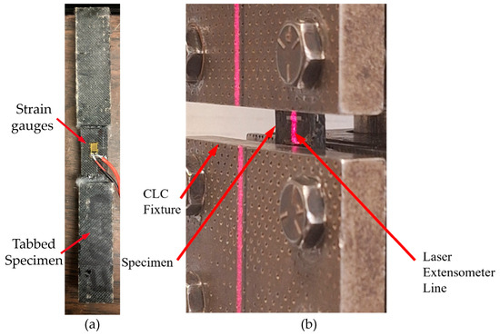 To validate the theoretical predictions, an attempt was made to convert the biaxial fabric to a uniaxial configuration by painstakingly removing the orthogonal fibers from the biaxial fabric. This attempt was made since, at the time, we could not source any unidirectional basalt fabric. The resulting fabric was not ideal as it was somewhat wavy, and the fiber distribution did not remain as uniform as desired. The fabric was used to generate compression test specimens with epoxy and Recyclamine matrices. The tests were carried out in accordance with the ASTM D6641M [41], using the Combined Loading Compression (CLC) fixture. To prevent Euler buckling and ensure that the loading was restricted to the gauge region, the specimens were tabbed with care using fiberglass. Strains were monitored with a laser extensometer, as shown in Figure 6.