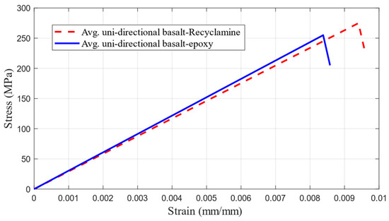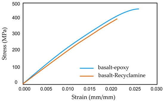 Comparison of the stress–strain comparison between basalt–epoxy and basalt–Recyclamine composites.