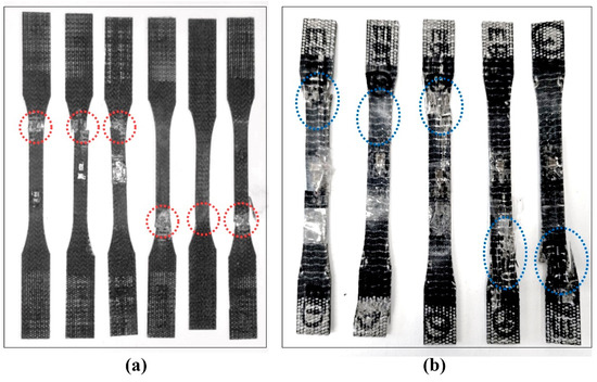 Fracture locations (identified by dotted red and blue boundaries) of tensile specimens after testing: (a) basalt–epoxy composite, (b) basalt–Recyclamine composite.