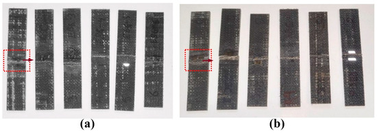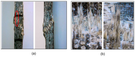 Post-compression test images of unidirectional basalt fiber composite specimens: (a) basalt–epoxy; (b) basalt–Recyclamine.