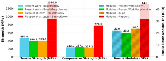 A comparative analysis of mechanical properties obtained in the current research and available literature is presented in Figure 11. The figure illustrates the comparison between tensile and compressive strengths, and the tensile modulus of various basalt fiber composite systems investigated by several researchers.