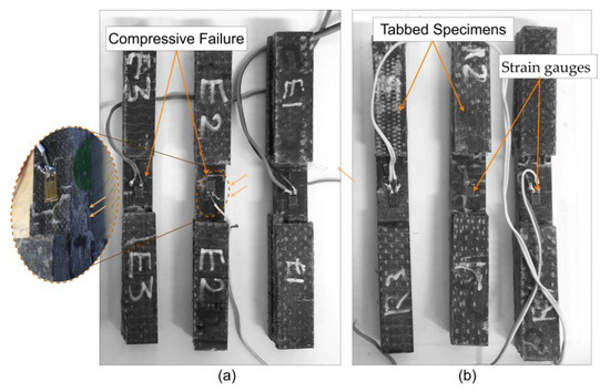 In general, the theoretical models’ predictions of the elastic moduli were found to be conservative, whereas the predicted strength values were nonconservative in most cases. This can be attributed to several factors, including, but not limited to, the presence of voids, fiber misalignment, and the assumptions held in the theoretical models, which assume an ideal condition that cannot be achieved using the vacuum-assisted hand layup fabrication method. Previous studies showed that such models were more accurate for property predictions for aerospace-grade composites manufactured under optimized conditions. Nevertheless, the comparison of experimental and theoretical values provides an important insight into how these models’ predictions should be treated when applied to non-autoclaved, non-prepreg reinforced composites. Nevertheless, these micromechanical models ought to be considered as approximate guidelines because of the large deviations noted, especially when predicting strength. Extension of these micromechanical models to structural design details in composites must be accomplished cautiously and with experimental calibration and validation, particularly in composites manufactured by VARTM or any other non-optimum process. Figure 13 shows the representative compressive failure images of unidirectional basalt–epoxy and basalt–Recyclamine test specimens. As seen, definite signs of compressive failure are detected in the test specimens, and the use of tabs and strain gauges can also be noted, which provided proper load introduction and accurate measurement of the strains during tests.