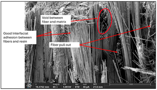 The SEM micrographs illustrated in Figure 14 and Figure 15 reveal relevant information about failure behaviour and adhesion in both composites at interfaces. Although full vacuum-assisted infusion and stitched fabric reinforcement were used to promote uniform resin distribution, some localized fiber clusters were observed, which is inherent to somewhat loosely stitched fabric architectures. For BE samples, high adhesion at interfaces between fibers and matrix is evident, with the presence of a few voids potentially acting as sources for stress concentrations. For BR samples, a similar intensity of interface quality is observed but accompanied by a clear presence of fiber pull-outs, which indicates variation in the progression of the failure mechanism.