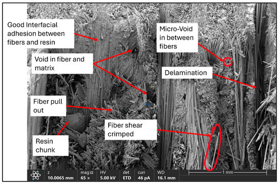 SEM image (×65) of the fracture surface of a basalt–Recyclamine composite specimen, highlighting delamination, fiber shear crimping, micro-voids, and resin chunks.