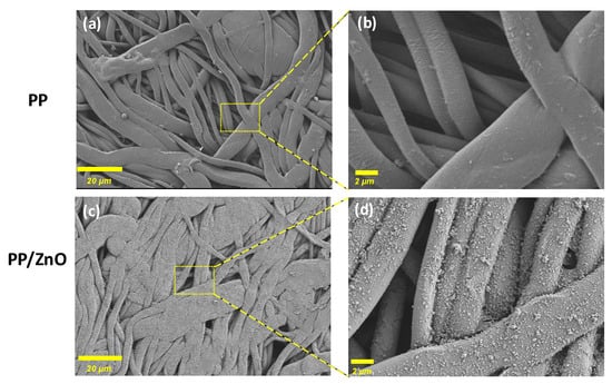 SEM analysis of the unmodified PP fibrous membrane revealed a relatively regular fiber structure with noticeable variations in fiber diameter and visible pore distribution (Figure 2a,b). After ZnO modification, the PP/dopamine@ZnO surface displayed distinct nanoscale protrusions, indicating successful nanoparticle deposition (Figure 2c,d).