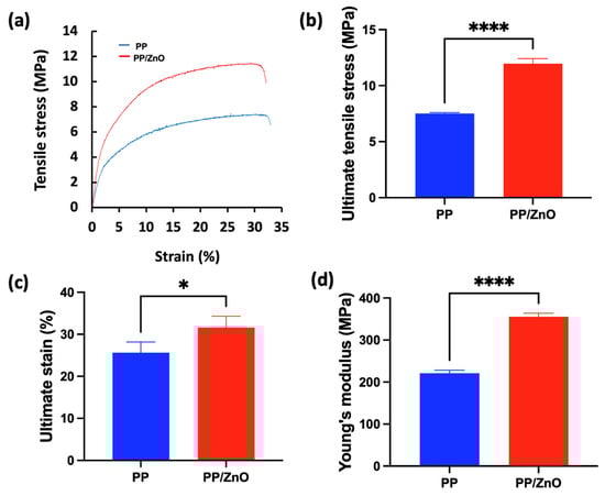 Tensile stress–strain curves and analysis of PP and PP/dopamine@ZnO membrane: (a) stress–strain curves of PP and PP/dopamine@30 nm ZnO membranes; (b–d) the mechanical properties obtained from the tensile test including (b) ultimate tensile stress, (c) ultimate strain, and (d) Young’s modulus. * p < 0.05, **** p < 0.0001.