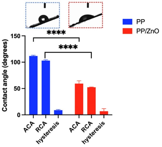 Advancing contact angle (ACA), receding contact angle (RCA) and hysteresis of PP and PP/dopamine@30 nm ZnO membrane samples. **** p < 0.0001.