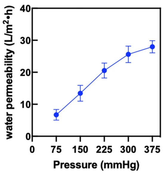 Permeation flux, defined as the volume of liquid passing through a unit area per unit time, is a key parameter for evaluating the filtration performance of a material as it reflects the rate at which the material allows liquid to pass through. As shown in Figure 6, the permeation flux of the Janus membrane exhibits a nearly linear relationship with pressure in the range of 75 mmHg to 375 mmHg. This indicates that the surface of the Janus membrane is relatively uniform, and the pore structure and permeation process are stable. At a pressure of 75 mmHg, the water flux is 6.72 ± 1.36 L/(m2·h), while at 375 mmHg, the water flux increases to 27.99 ± 1.56 L/(m2·h). These results confirm the reliable and efficient filtration performance of the Janus membrane across varying pressure levels.