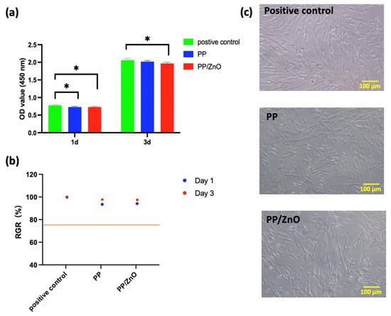 Biocompatibility of PP/dopamine@30 nm ZnO membrane: (a) cell viability of hDPSCs direct contact with PP and PP/ddopamine@30 nm ZnO membranes; (b) relative growth rate percentage of (a); (c) bright-field microscopy images of hDPSCs in direct contact without and with different membrane surfaces after 24 h of culture. * p < 0.05.