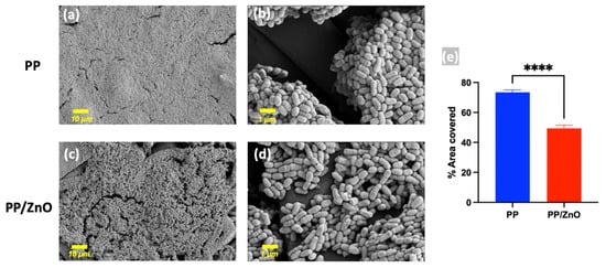 SEM images of S. mutans on membranes. The anti-biofilm effect against S. mutans on the surfaces of PP (a,b) and PP/dopamine@30 nm ZnO (c,d) membrane; (e) quantitative measurement of area covered by biofilm on SEM. **** p < 0.0001.